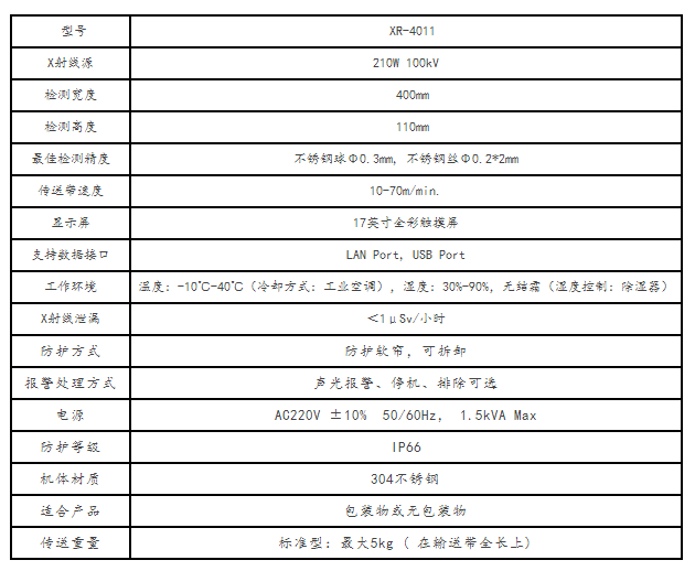 XR-4011 X射線異物檢測(cè)機(jī),其寬大的檢測(cè)通道及強(qiáng)大的載重能力,使其適用于各類大尺寸包裝產(chǎn)品,如食品,藥品,化工產(chǎn)品等。應(yīng)用于食品、醫(yī)藥、化工行業(yè)的金屬與非金屬異物檢測(cè)。不但能靈敏識(shí)別產(chǎn)品中的各種異物,如金屬、骨頭、玻璃、陶瓷、石子、硬質(zhì)橡膠、硬質(zhì)塑料等,而且能提供的產(chǎn)品完整性檢測(cè),識(shí)別產(chǎn)品缺陷,缺損等。