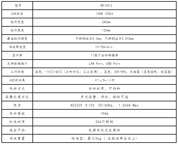 XR-2412 X射線異物檢測機(jī),適用于餅干,薯片,嬰幼兒食品,藥品等小袋包裝物料的檢測。應(yīng)用于食品、醫(yī)藥、化工行業(yè)的金屬與非金屬異物檢測。不但能靈敏識別產(chǎn)品中的各種異物,如金屬、骨頭、玻璃、陶瓷、石子、硬質(zhì)橡膠、硬質(zhì)塑料等,而且能提供的產(chǎn)品完整性檢測,識別產(chǎn)品缺陷,缺損等。